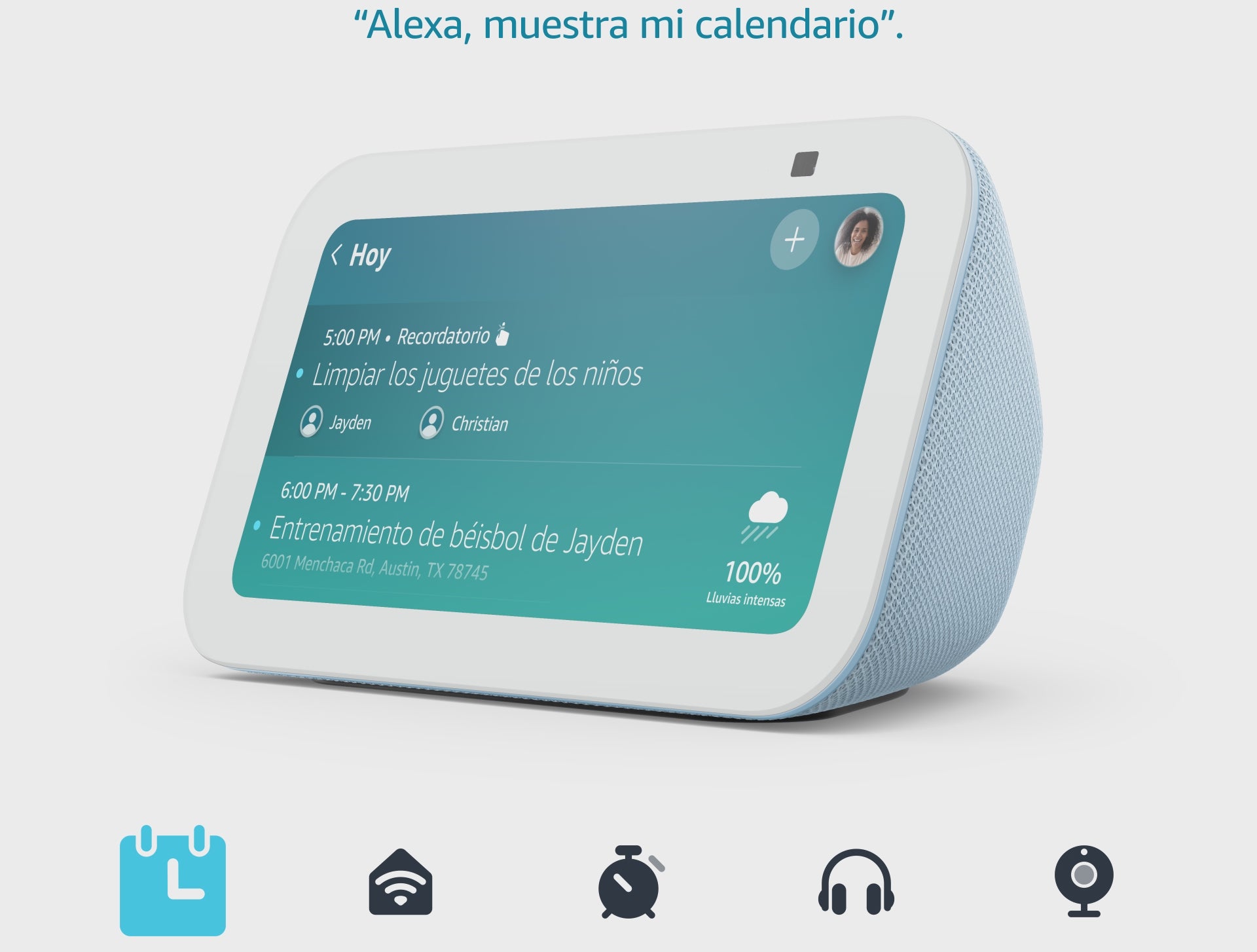 El Echo Show 5 incluye una pantalla de 5.5” donde puedes ver las noticias y el clima de un vistazo, hacer videollamadas, consultar el