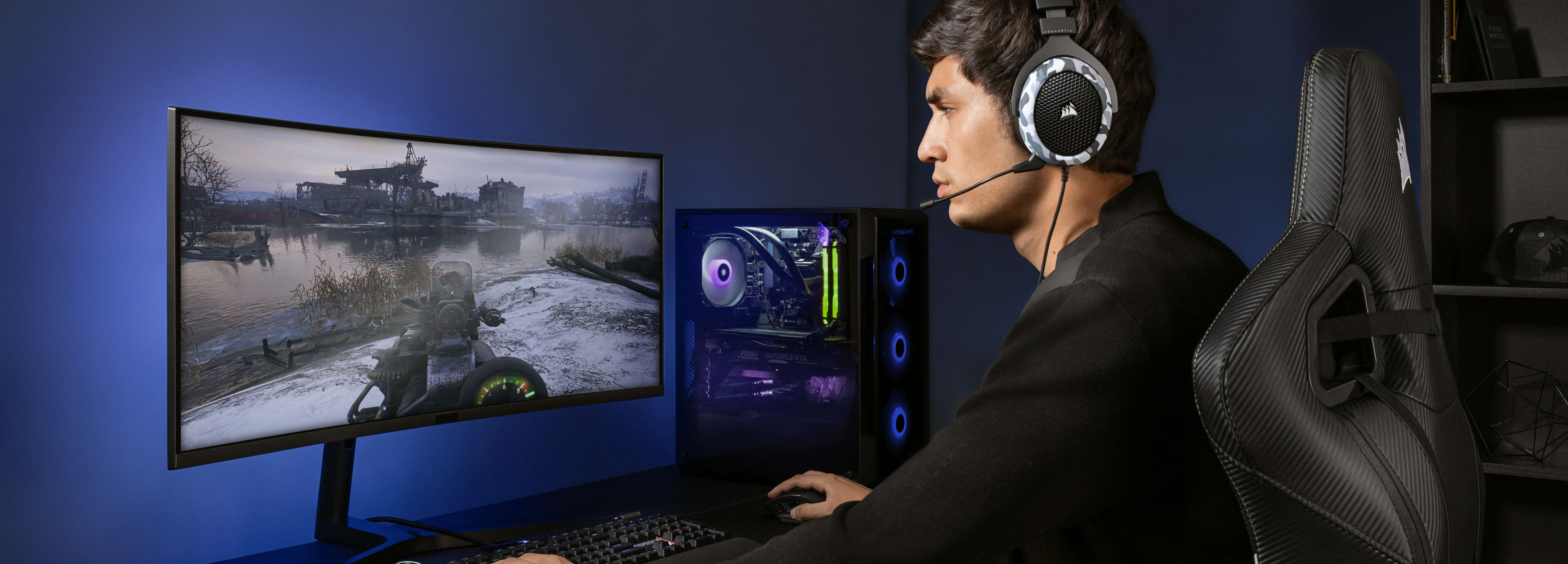Los auriculares para juegos CORSAIR HS60 HAPTIC ofrecen efectos hápticos en los bajos que se pueden sentir, con cómodas almohadillas de espuma viscoelástica y transductores de neodimio de 50 mm de ajuste personalizado para disfrutar de un audio de calidad.
