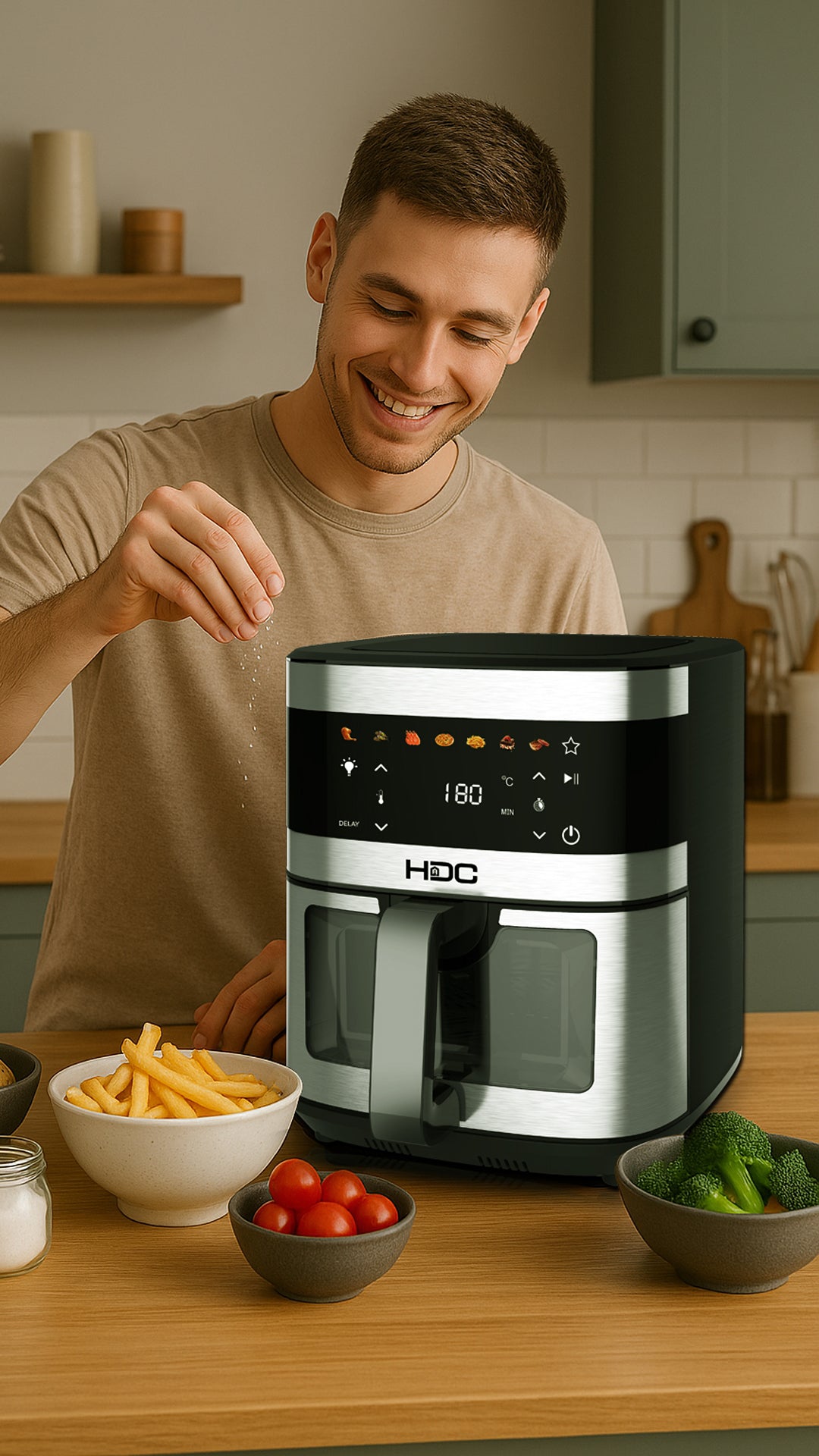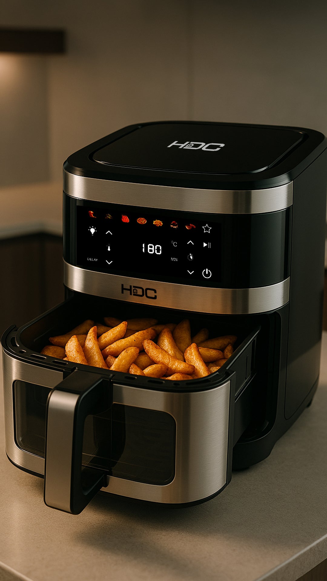 La freidora de aire HDC modelo HAF-DH91SB es la solución perfecta para quienes buscan una cocina más saludable, rápida y eficiente. Con una amplia capacidad de 9.1 litros y una rejilla de cocción incluida, permite preparar porciones generosas para toda la familia, ideal para asar, hornear o freír sin aceite.