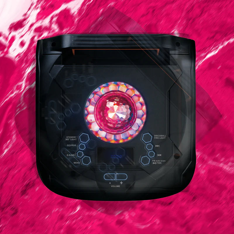 Desde el centro del tablero sobresale una esfera de luces de boliche que se proyectan en todas direcciones, acompañando el ángulo 360° que recorre el sonido con este parlante, y confiriéndole un diseño único y singular entre los Party Speakers. Sus variantes de efectos de luz LED son regulables con botones ubicados a ambos costados del panel. Tiene funciones exbass y FM, conexiones de micrófono y guitarra, entrada de alimentación y entrada auxiliar.