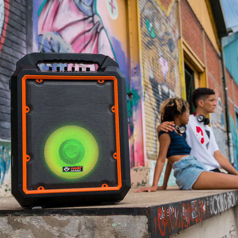 El Speaker Moonki Sound MS-1200B es un parlante activo de dos vías capaz de brindar un verdadero sonido estéreo con conectividad inalámbrica Bluetooth. Sus tiempos de reproducción largos y de calidad son posibles gracias a su potencia, su placa amplificadora y sus baterías de gel de alta capacidad. Proporciona también una buena ambientación lograda a través de sus efectos de luces LED y, por sobre todo, un grato momento de relajación para escuchar, cantar en el karaoke y compartir tu música a tu manera.