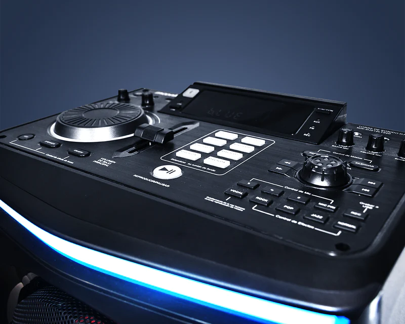 Completo panel de control que permite regular no sólo la reproducción y el volumen sino también los efectos lumínicos y sonoros, las ecualizaciones pre-seteadas y control de refuerzo de graves, entre otras.