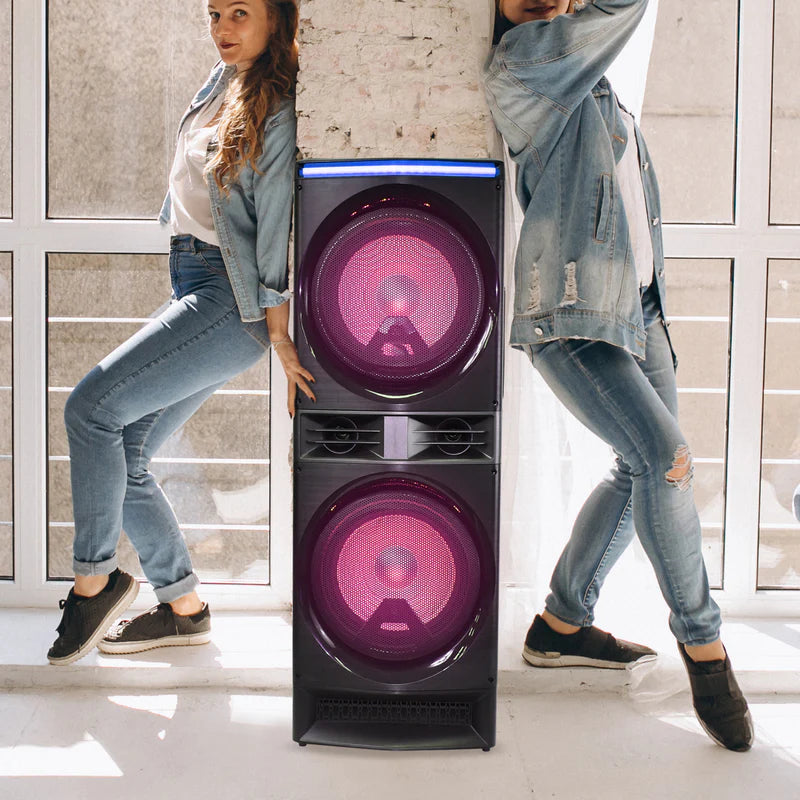 Configuración de dos vías a través de su doble woofer de 12", ambos con iluminación en toda su superficie y control de efectos de luz profesional.