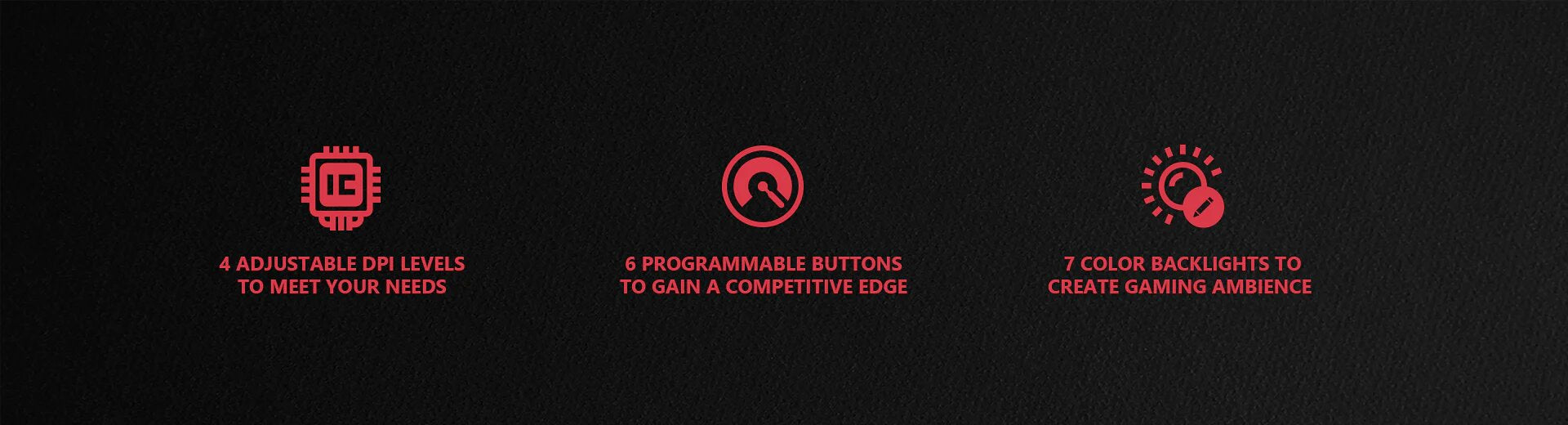 Su DPI ajustable (1000 / 1600 / 3200 / 6400) permite personalizar la sensibilidad según tus necesidades, desde movimientos suaves y precisos para disparos certeros hasta desplazamientos rápidos para maniobras agresivas en partidas intensas. Cada uno de sus 6 botones programables puede configurarse para comandos, macros o accesos directos, brindándote una experiencia de juego completamente adaptada a tu estilo y estrategia.