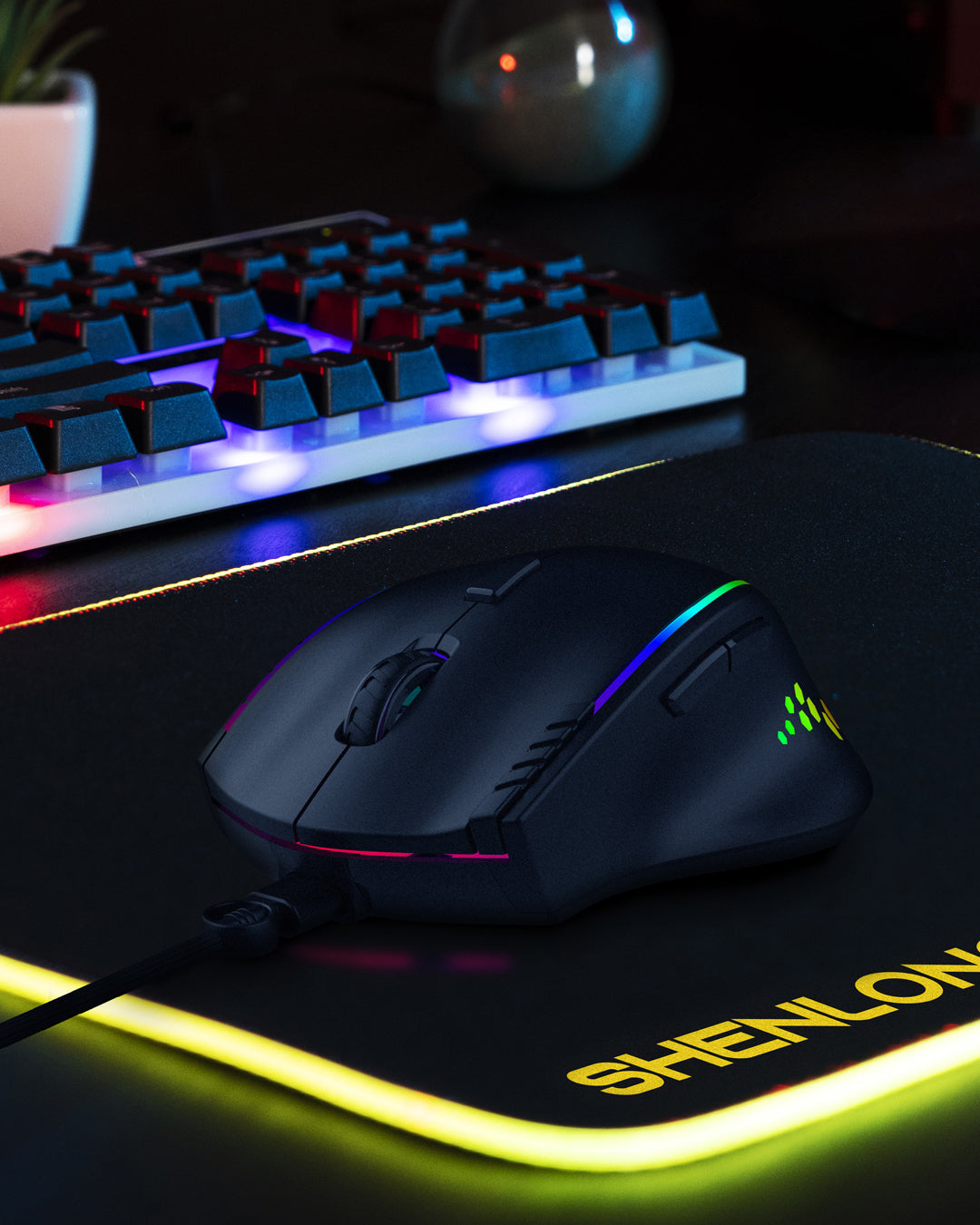El diseño del Shenlong SH-M720H combina ergonomía y estilo. Su estructura con acabado de inyección de plástico antideslizante en ambos lados proporciona un agarre seguro y cómodo, reduciendo la fatiga en largas jornadas de juego. Además, incorpora un sistema de iluminación LED RGB, que añade un toque dinámico y personalizable al setup gamer.
