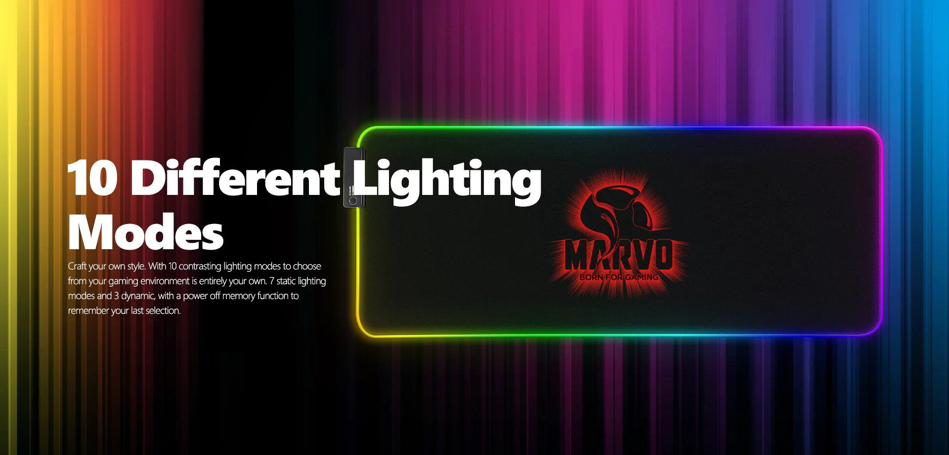 Uno de los aspectos más destacados del Marvo G45 Pro XL es su iluminación LED RGB de 7 colores, que recorre elegantemente todo el contorno del mousepad. Esta iluminación puede configurarse entre tres efectos distintos —color fijo, respiración y cambio gradual—, lo que permite personalizar el espacio de juego y adaptarlo al estilo o estado de ánimo del usuario. A diferencia de otros modelos, el G45 Pro XL cuenta con un control táctil integrado ubicado en la parte superior, que permite cambiar el modo o el color de la retroiluminación con un simple toque. No requiere software ni configuraciones adicionales: la personalización es instantánea y práctica, directamente desde el propio mousepad.