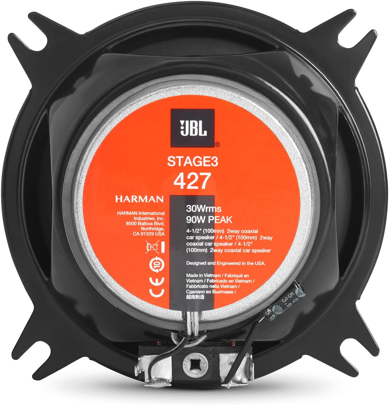El JBL Stage3 427 es un parlante automotriz de 2 vías diseñado para mejorar el sistema de sonido de tu vehículo con la calidad y potencia característica de JBL. Con un tamaño compacto de 4 pulgadas, ofrece un audio claro y detallado, combinando agudos nítidos y graves definidos.