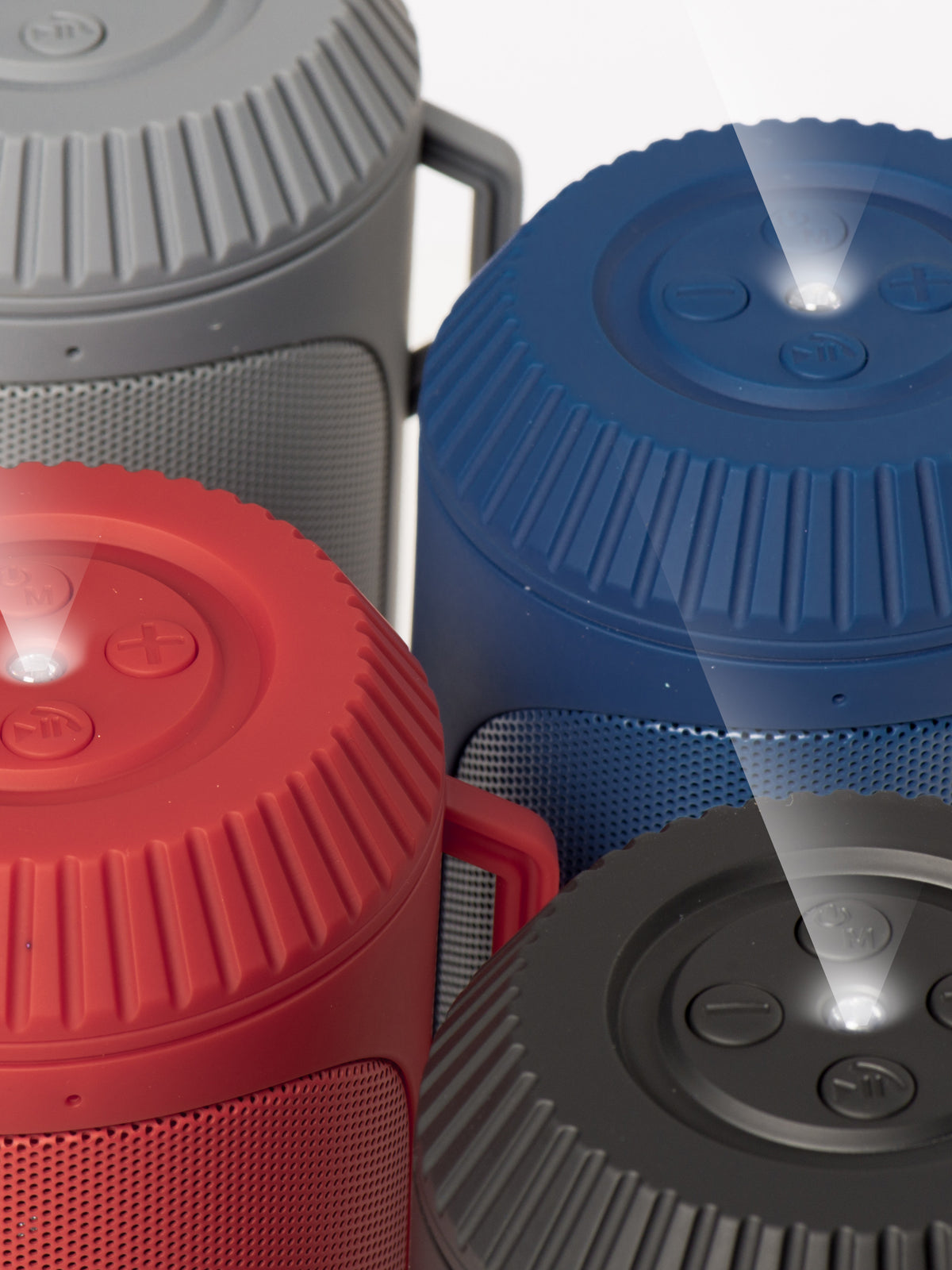 Cada altavoz está equipado con una linterna de emergencia incorporada para mayor funcionalidad.