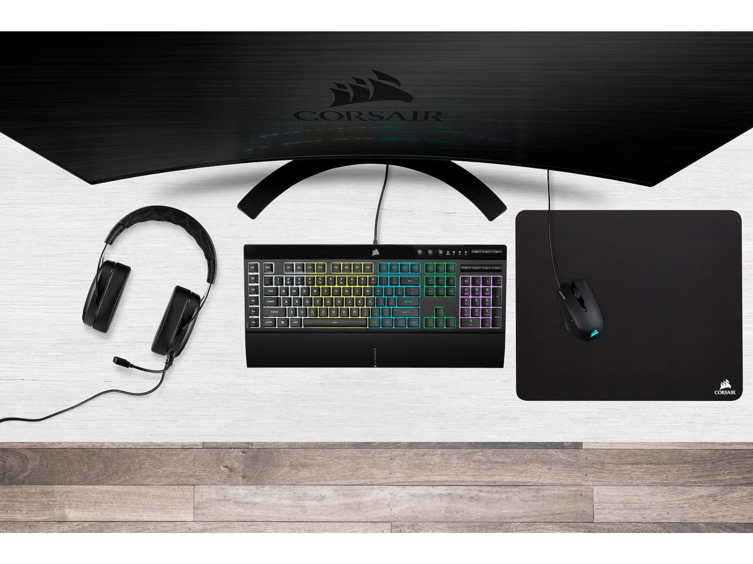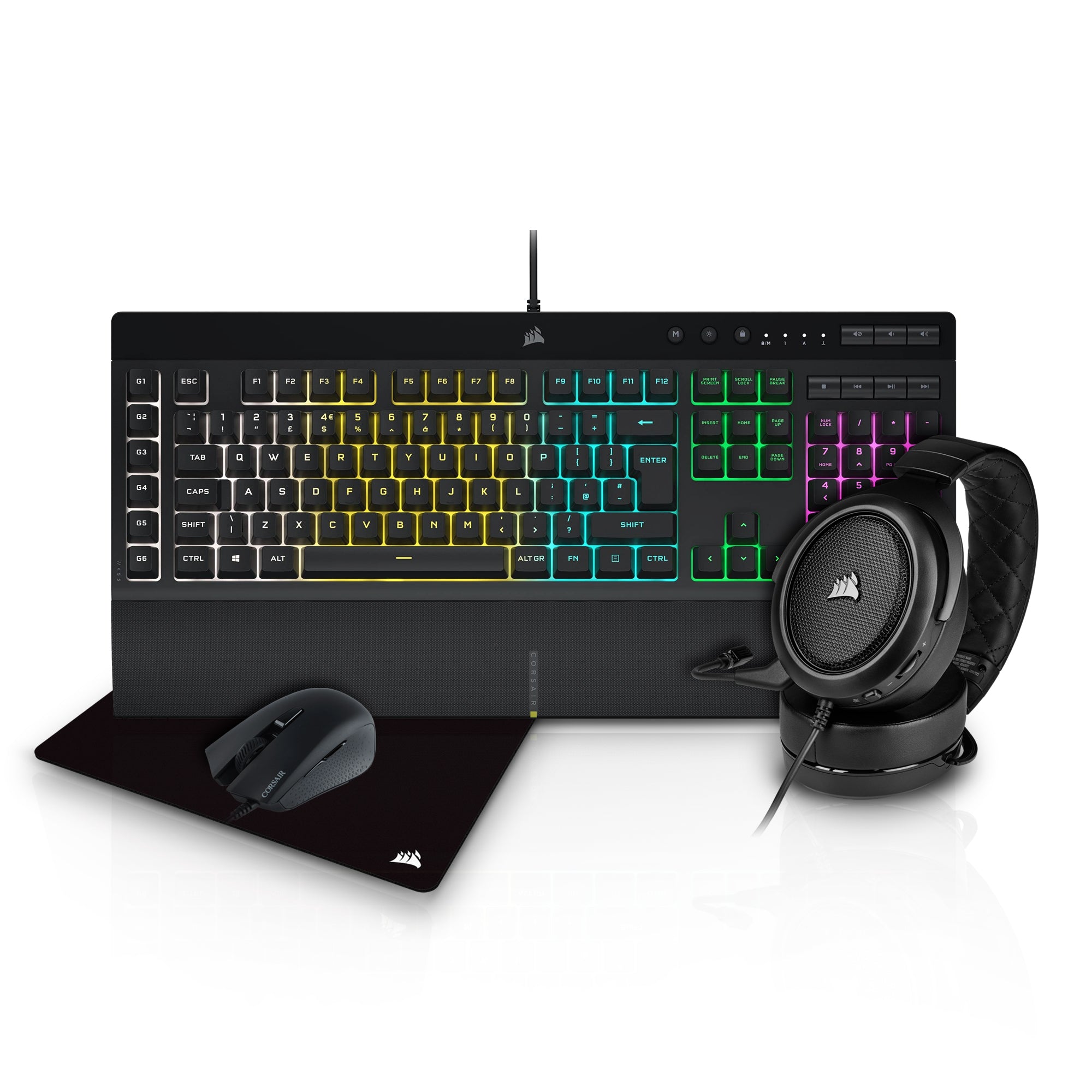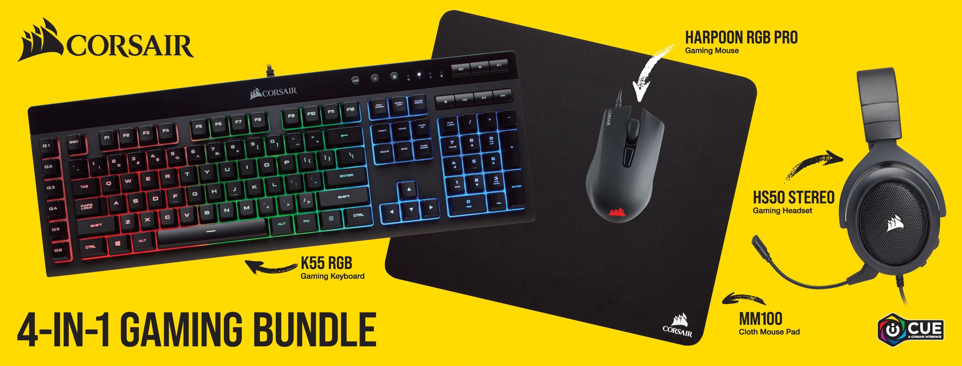 Este paquete completo incluye el teclado K55 RGB Pro, el mouse Harpoon RGB Pro, los auriculares HS50 y la alfombrilla para mouse MM100, lo que le brinda todo lo que necesita para iniciar una configuración de juego inmersiva y llevar tus partidas a otro nivel.