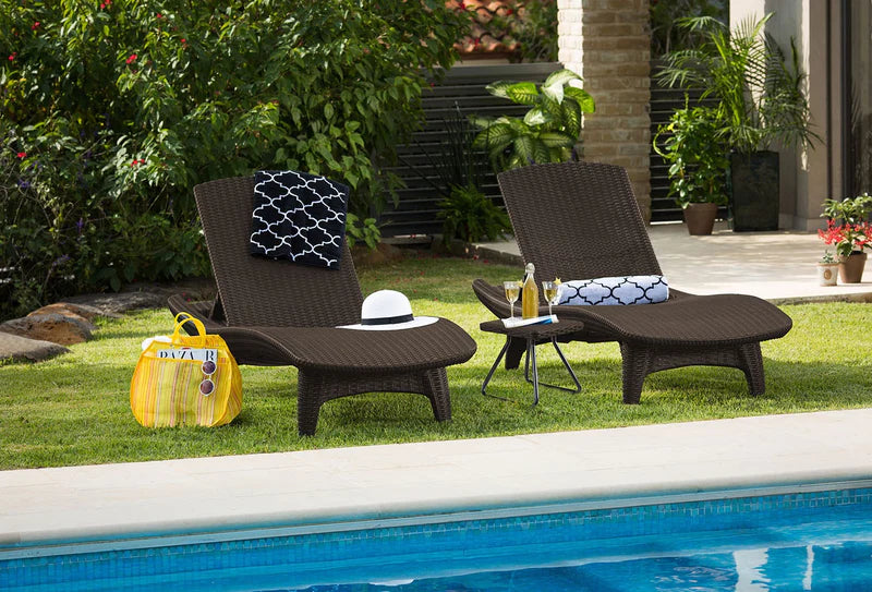 Sentite como si estuvieras en un paraíso tropical, sin importar dónde te encuentres. Este paquete contiene dos reposeras Pacific Sun, sillas de mimbre que son tan resistentes como elegantes. Ya sea que estés acostado junto a la piscina o tomando sol en tu jardín, determiná cuál es tu ángulo favorito con una variedad de posiciones de respaldo. Este juego viene acompañado de una práctica mesa para apoyar tu bebida, celular, etc.