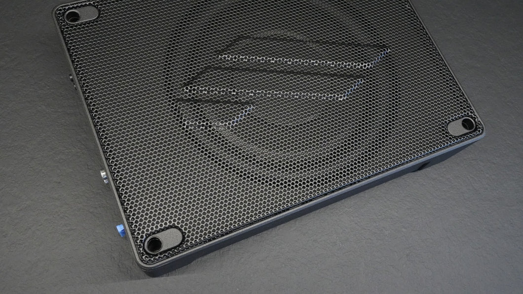 Su diseño compacto (280 x 208 x 62 mm) es una de sus mayores ventajas: puede instalarse fácilmente bajo el asiento, en la parte trasera o en espacios reducidos sin sacrificar rendimiento. A pesar de su tamaño, el subwoofer incorpora una estructura robusta y materiales de alta calidad, que aseguran durabilidad y una excelente disipación del calor.