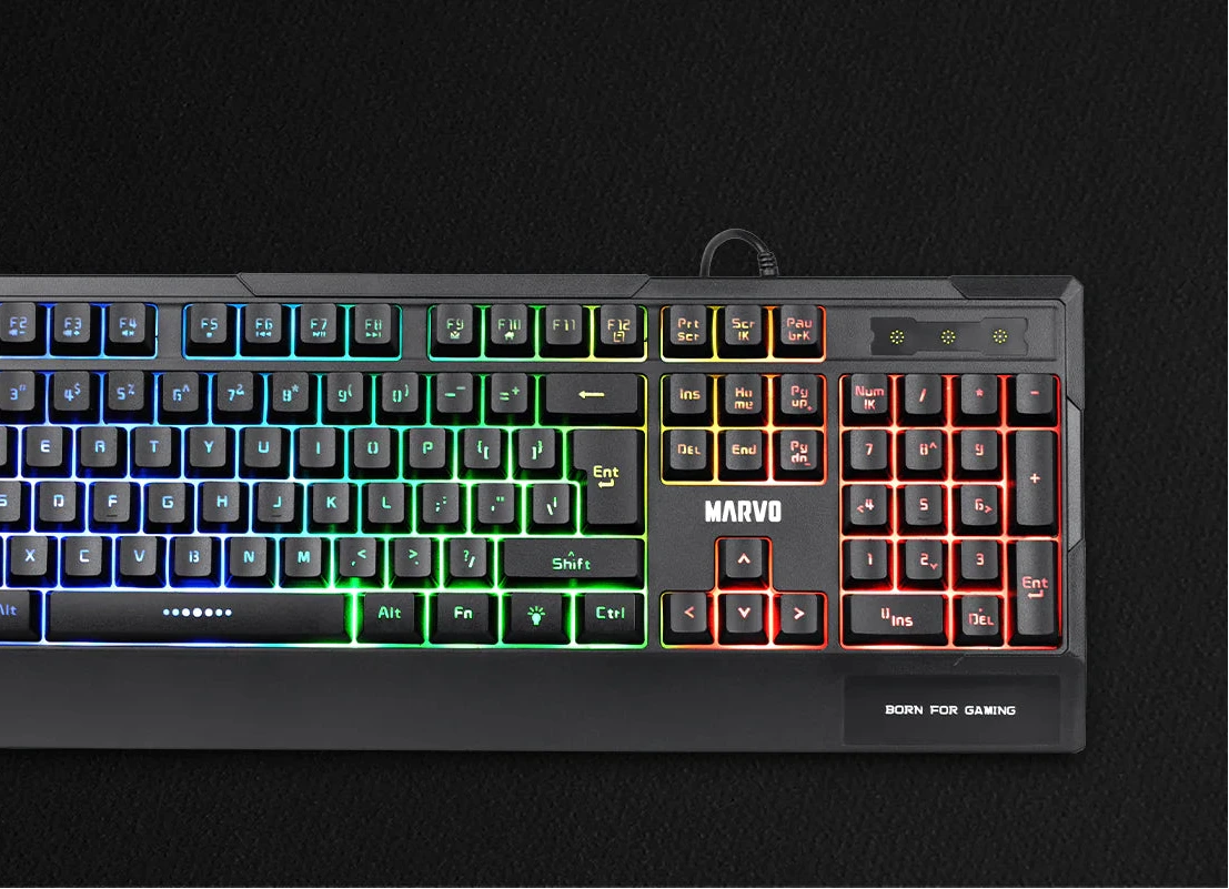 El Marvo K606 combina simplicidad y diseño gamer. Con retroiluminación LED en 3 colores fijos, es un teclado de membrana confiable y duradero, pensado para usuarios que buscan funcionalidad sin complicaciones.