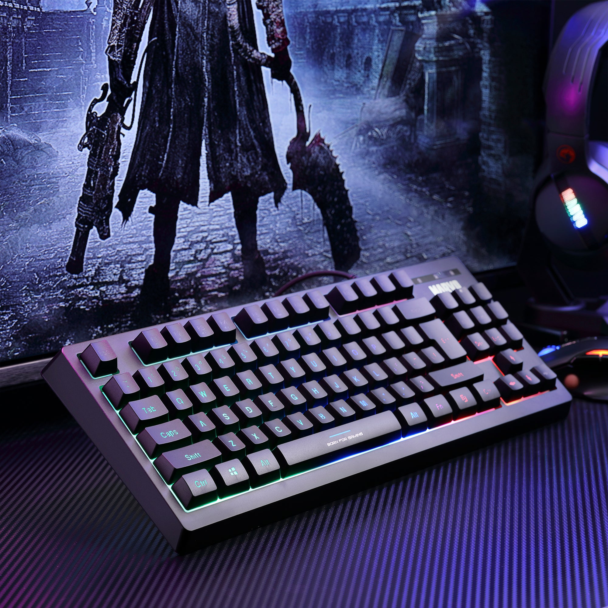 El Marvo K607 es un teclado compacto de membrana con diseño TKL (sin pad numérico), perfecto para escritorios pequeños o setups minimalistas. Su retroiluminación RGB ofrece un look gamer atractivo.