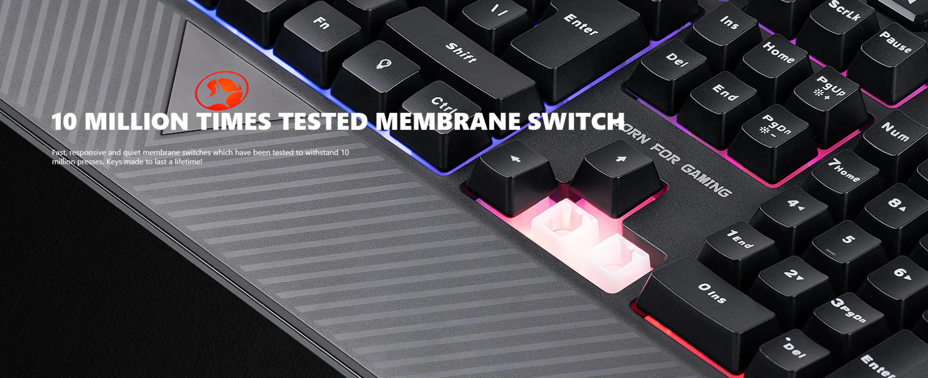 El Marvo K656 es un teclado gaming diseñado para ofrecer una experiencia equilibrada entre rendimiento, comodidad y durabilidad. Con 112 teclas y un diseño robusto, combina practicidad y precisión en cada pulsación, convirtiéndose en una excelente opción para quienes buscan calidad sin renunciar al estilo gamer. Su estructura con interruptores de membrana brinda una respuesta silenciosa y agradable al tacto, ideal para largas sesiones de juego o escritura intensiva. Cada tecla cuenta con una vida útil de hasta 10 millones de clics, garantizando una resistencia superior y un funcionamiento confiable a lo largo del tiempo.