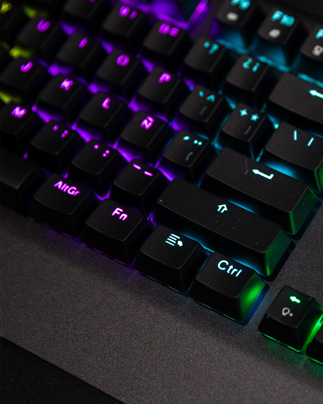 Con interruptores switch blue optimiza tu capacidad de respuesta y eleva el rendimiento, sus teclas resisten hasta 50 millones de pulsaciones. Realiza ajustes sin perder la euforia del juego con las teclas multimedia, asegúrate de la precisión en tus movimientos a través del sistema Anti-ghosting, y acompaña toda la acción con el estilo épico de la iluminación RGB.
