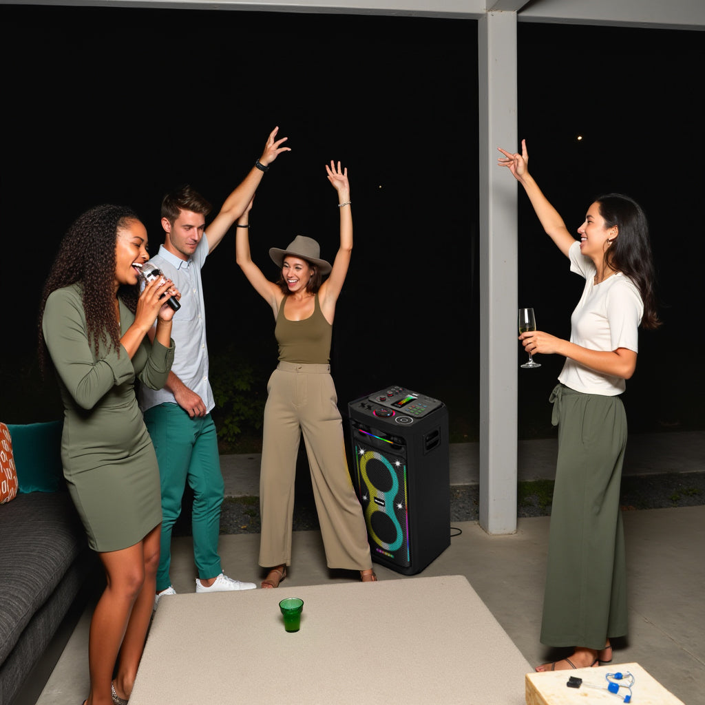 Iluminación LED dinámica que acompaña la música, y entrada para micrófono con efectos de voz como eco, reverberación y cambio de tono para sesiones de karaoke inolvidables.